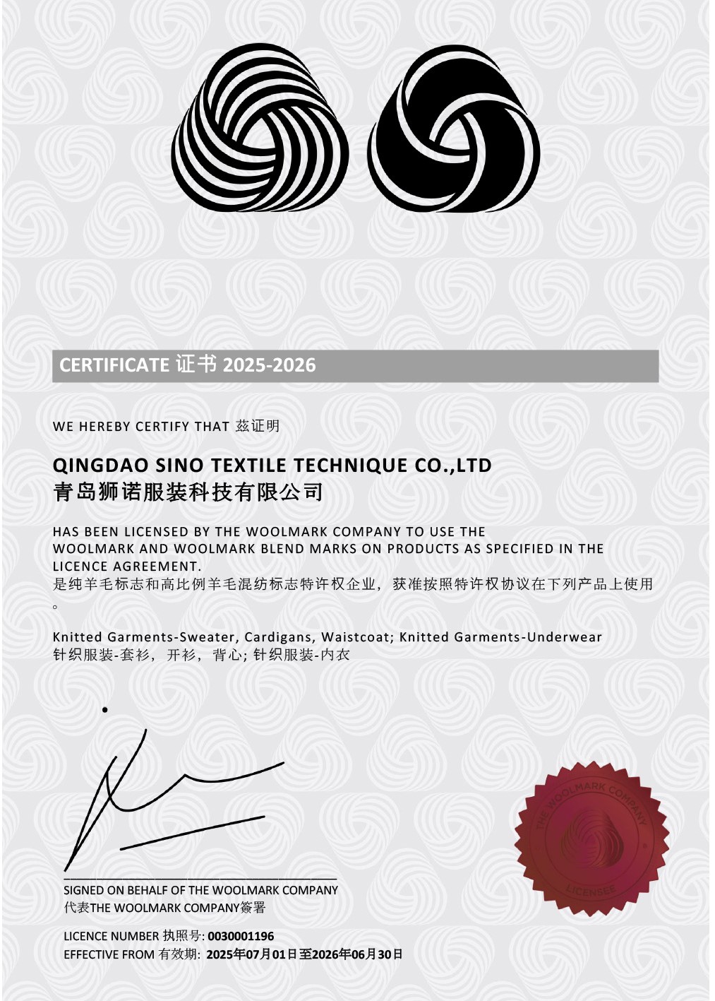 青岛SINO纺织品公司,建立于2005年,以新科技、新产品研发为驱动,以澳大利亚美丽诺羊毛为原材料,生产各类婴幼儿和成人运动休闲类的内、外穿服装,产品符合Oeko-tex 100 standard婴儿类、REACH、GOTs、RWS……等,各项欧盟和国际标准,近二十年来,为丹麦、瑞典、挪威等北欧国家,以及法国、德国、英国、瑞士等西欧国家的中、高端品牌,提供高品质的服装和服务。2006年,研发成功,... ...